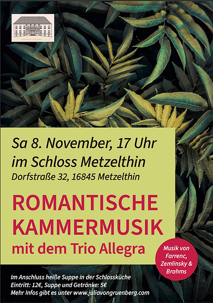 * Konzert des Trio „Allegra“, bestehend aus Katharina Litschig (Violoncello), Yuki Inagawa(Klavier) und Sabina Matthus-Bebie (Klarinette), es widmet sich der Kammermusik der Romantik. 8. November im Saal um 17 Uhr => Programm hier